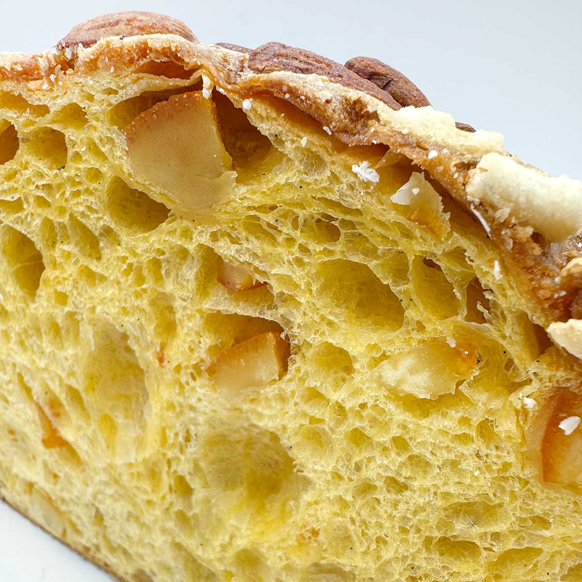 La pâte est enrichie d’écorces d’orange confites à 30 % — un pourcentage généreux, que l’on sent à chaque bouchée — de beurre sélectionné, de miel, de malt et de jaunes d’œufs frais de catégorie 1A. Le glaçage est un équilibre précis d’amandes avec peau, amandes émondées et amandes amères : trois textures différentes qui créent cette croûte croquante, signe distinctif d’une colomba réalisée dans les règles de l’art.